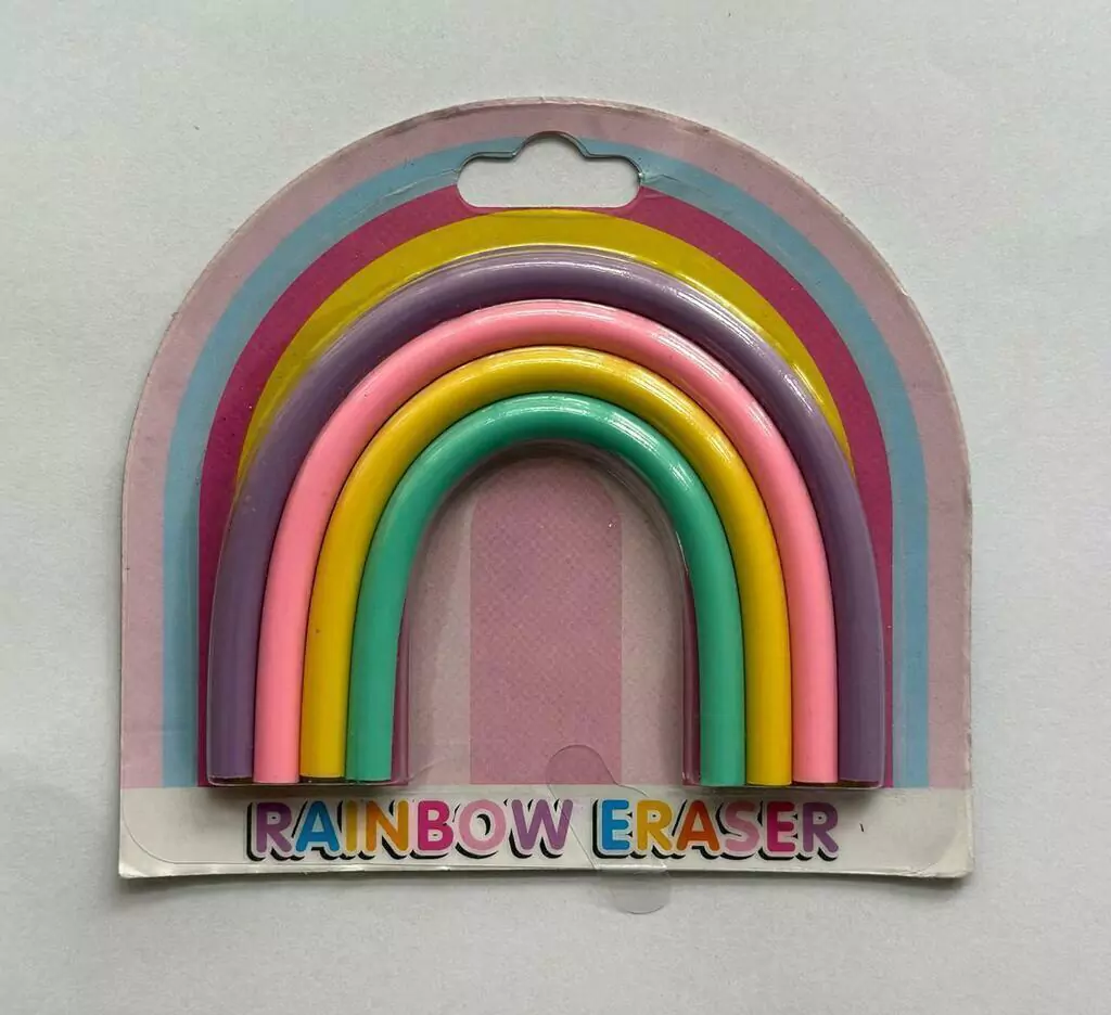 borracha de arco-íris charme nas cores verde, amarelo, rosa e roxo, atóxica, divertida e útil na hora de apagar