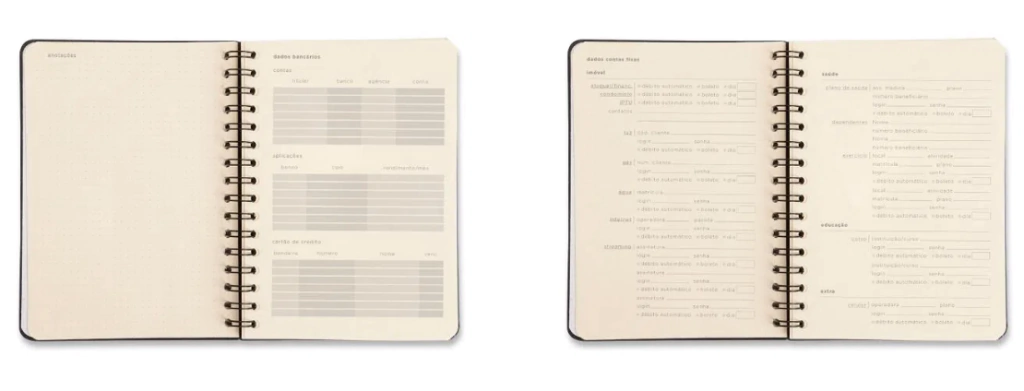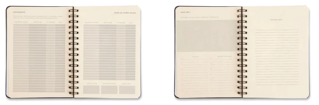 planejamento anual, obejetivos financeiros (curto,medio e longo prazo), visão mensal, planejamento financeiro mensal, planejamento cartão de crédito mensal e checklist+início do mês
